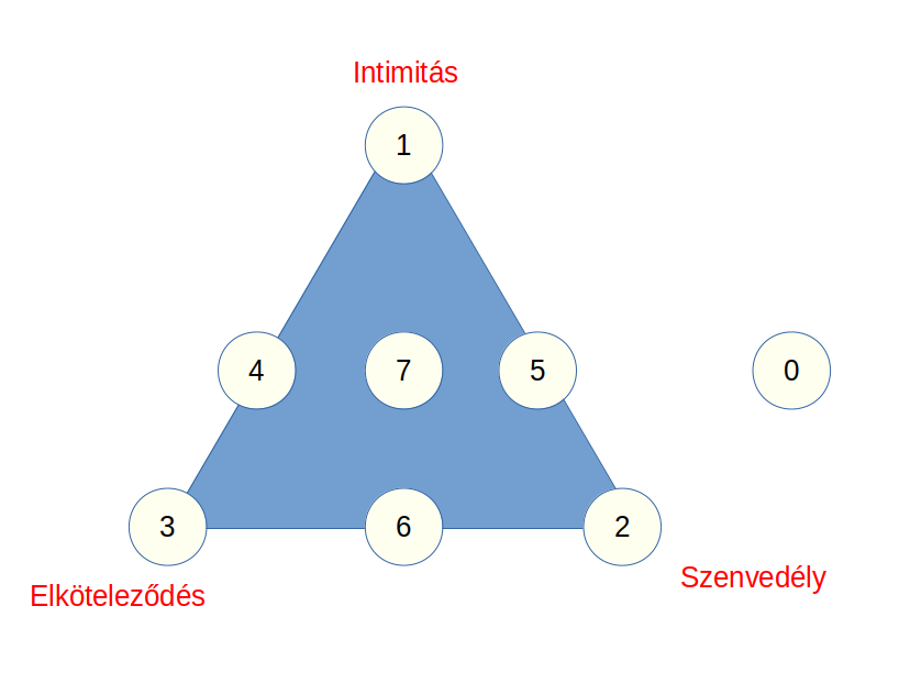 Ha ábrázoljuk az elméletet grafikusan is, akkor egy egyenlő oldalú háromszögben, mint koordinátában írható le ez a rendszer, amindek mindösszesen 8 [0-7] állapota van. A háromszögön kívül eső állapot [0] egyik összetevővel sem rendelkezik. Az [1-3] számokkal jelölt helyzetekben egy-egy összetevő jelenlétét tapasztalhatjuk meg, míg a [4-6] állapotok két-két összetevővel bírnak. A 7 számmal jelölt állapot mindhárom összetevőt magában foglalja. De mit jelentenek Sternberg rendszerében ezek a számok a szerelem típusára tekintettel? Az alábbiakat: